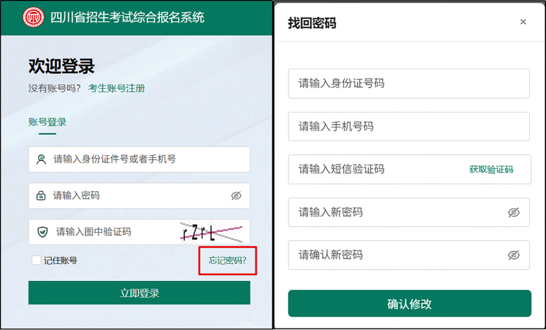 输入证件号码、手机号码、短信验证码、输入2次一致的新密码,点击“确认修改”按钮。