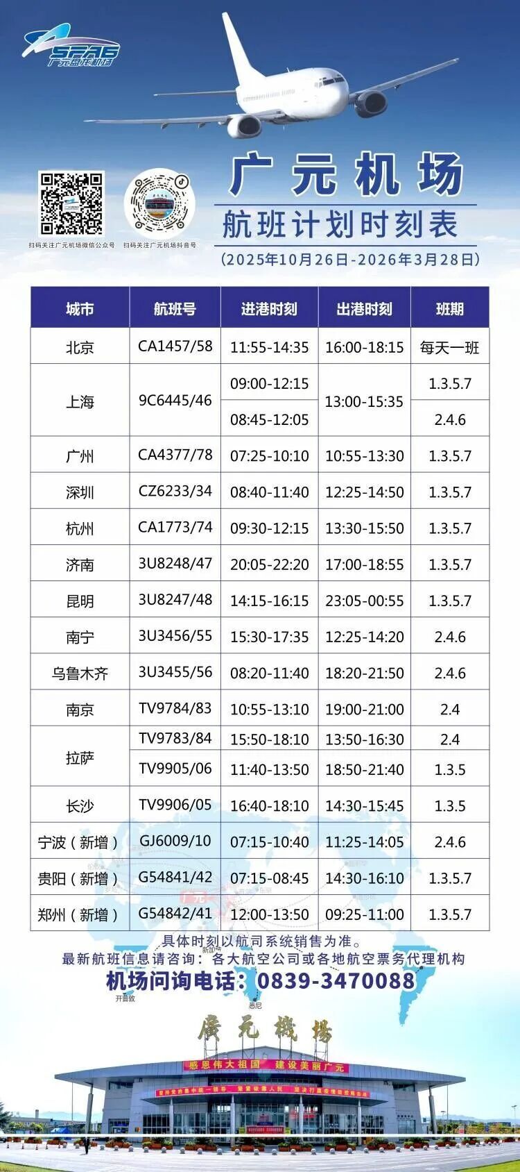 好消息!为进一步完善航线网络、便利旅客出行,广元机场将于12月16日起正式开通广元至宁波直飞航线。每周二、四、六各一班,票价低至400元起!